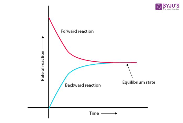 The chemical equilibrium in a reversible reaction is the state at which both forward and backward reactions occur at the same speed. The stage of the reversible reaction at which the concentration of the reactants and products do not change with time is called the equilibrium state. Or The state in which the measurable properties of the system such as pressure, density, colour or concentration do not undergo any further noticeable changes with time under a given set of conditions is said to be a state of equilibrium.